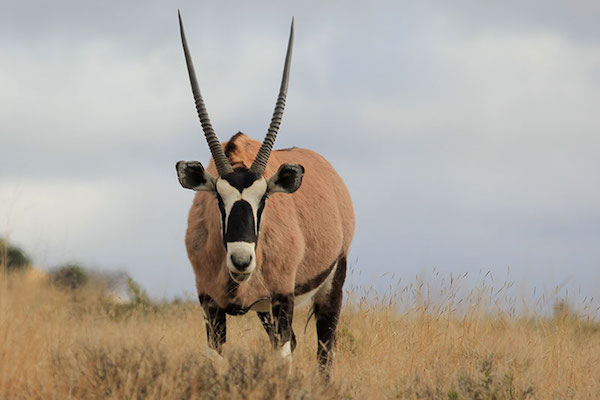 Gemsbok are light brownish-grey to tan in colour, with lighter patches toward the bottom rear of the rump. Their tails are long and black in colour. A blackish stripe extends from the chin down the lower edge of the neck, through the juncture of the shoulder and leg along the lower flank of each side to the blackish section of the rear leg. They have muscular necks and shoulders, and their legs have white 'socks' with a black patch on the front of both the front legs, and both genders have long, straight horns. Comparably, the East African oryx lacks a dark patch at the base of the tail, has less black on the legs (none on the hindlegs), and less black on the lower flanks. One very rare condition is the "Golden Oryx", in which the Gemsboks black markings are muted and now appear golden. Gemsbok are the largest species in the genus Oryx. They stand about 1.2 m (3.9 ft) at the shoulder.The body length can vary from 190 to 240 cm (75 to 94 in) and the tail measures 45 to 90 cm (18 to 35 in). Male gemsbok can weigh between 180 and 240 kg (400 and 530 lb), while females weigh 100–210 kg (220–460 lb).